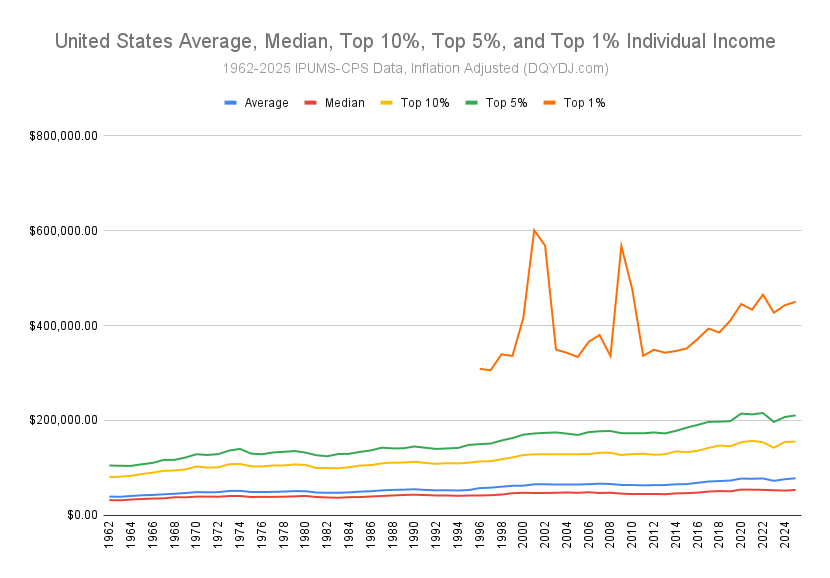 These graphs summarizes the average, median, top 1%, top 5%, and top 10% individual income by year from 1962-2025. The first one is inflation adjusted, while the second is not.